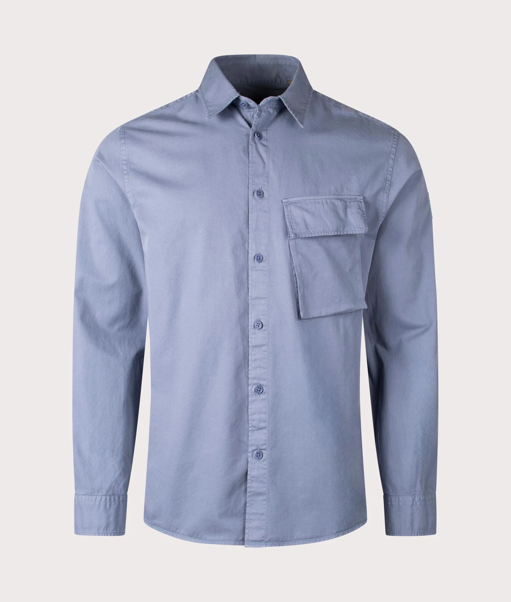 The Scale Shirt in 'Blue Flint' by Belstaff is a regular fitting, long sleeved shirt that has been crafted from 100% cotton fabric. This style incorporates a slanted chest pocket and a rear box pleat, allowing for a wider range of motion. Featuring the signature Belstaff phoenix patch logo to the left sleeve.