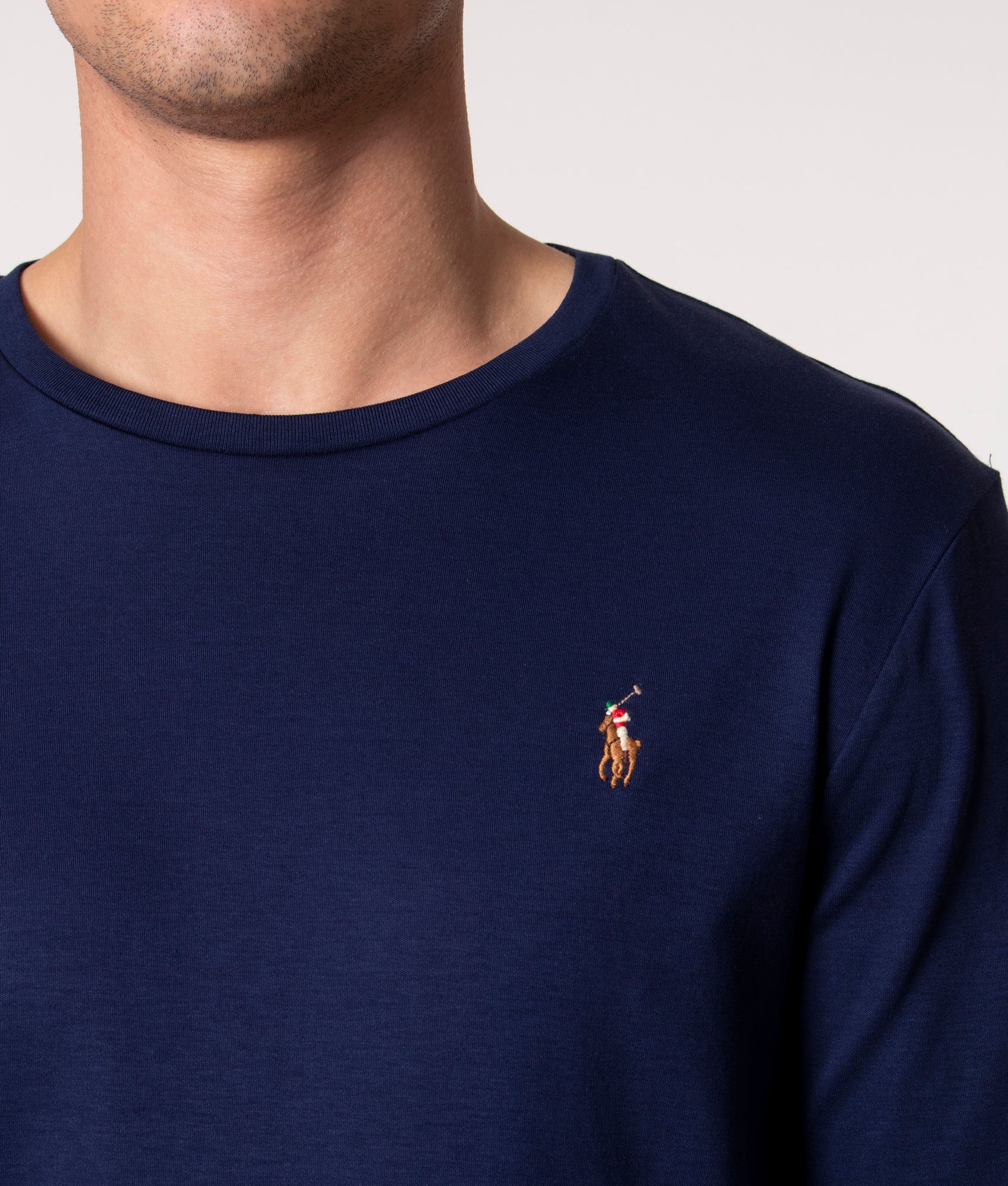 The Custom Slim Fit Interlock Long Sleeve T-Shirt in French Navy by Polo Ralph Lauren features; the signature pony logo on the chest to the left, a classic crew neck and long sleeves with a ribbed cuff.