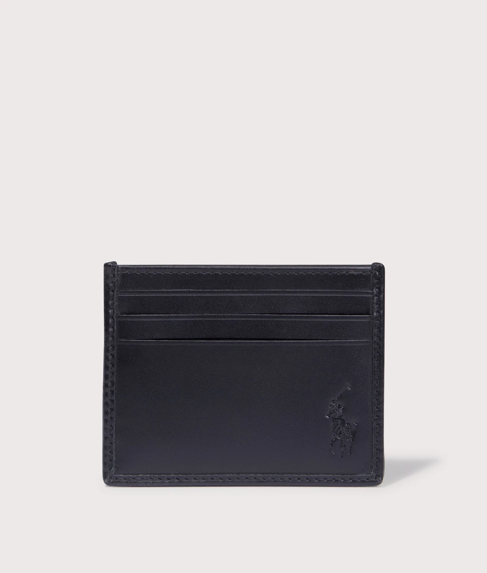 Contemporary style with an all over detail. This Signature Pony Leather Card Case in Black by Polo Ralph Lauren is the perfect addition to store your cards. Cut to a streamline silhouette and fashioned in supple calfskin. A handsome accessory to add to your collection, defined by three slip card pockets, Polo Pony print, and debossed branding to the bottom left.
