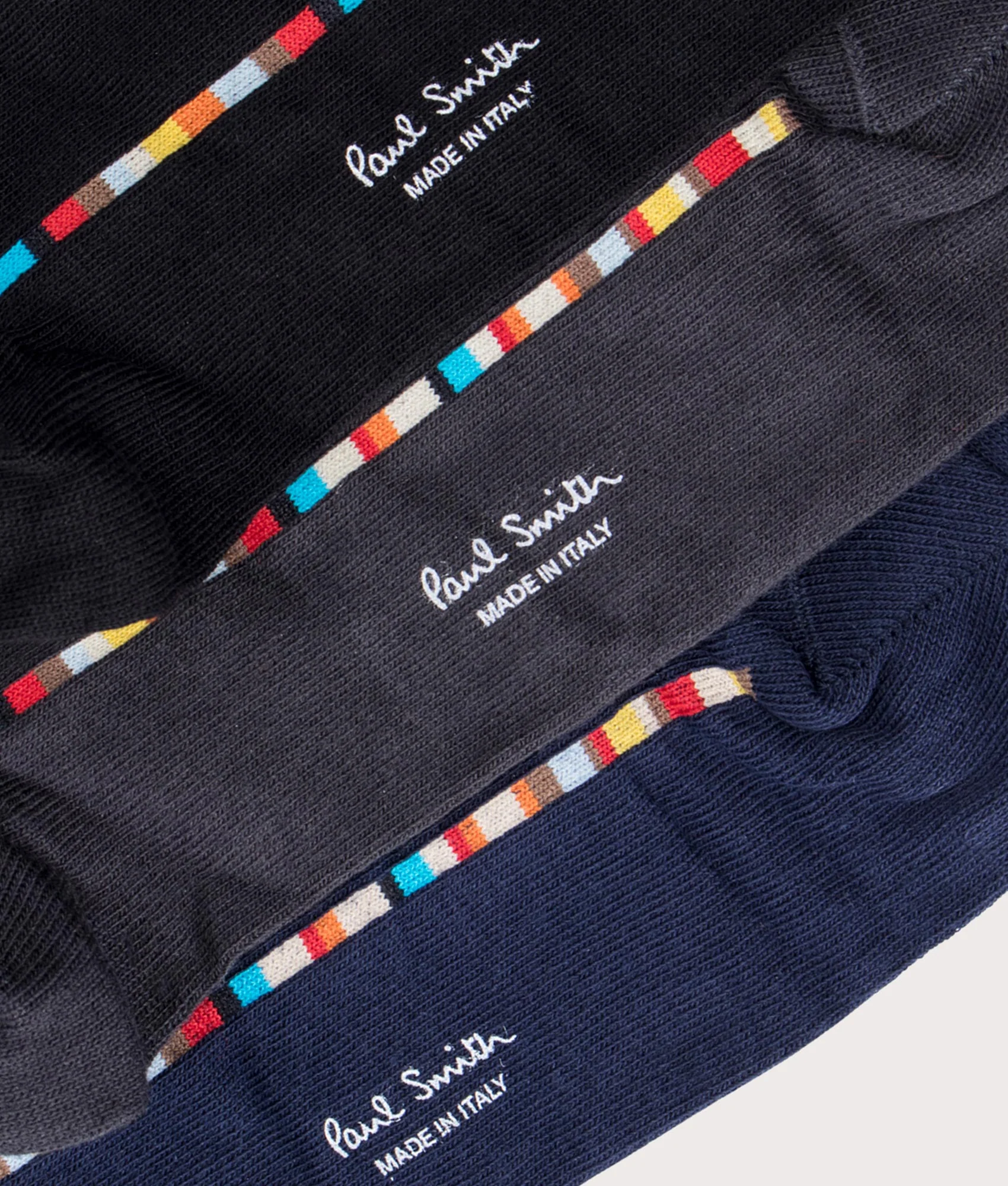 The Three Pack of Signature Stripe Vittore Socks in 'Multi' by PS Paul Smith offer a three pack of elegantly soft, cotton blended socks. Each pair is adorned with a central 'Signature Stripe' pattern and made complete with contrast PS Paul Smith branding. Presented in an 'Artist Stripe' gift box, making for the perfect gifting item, season after season.